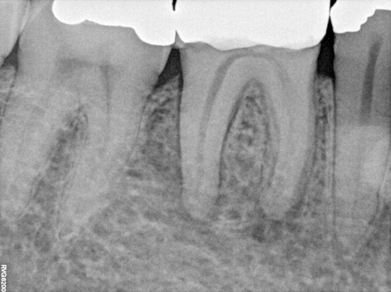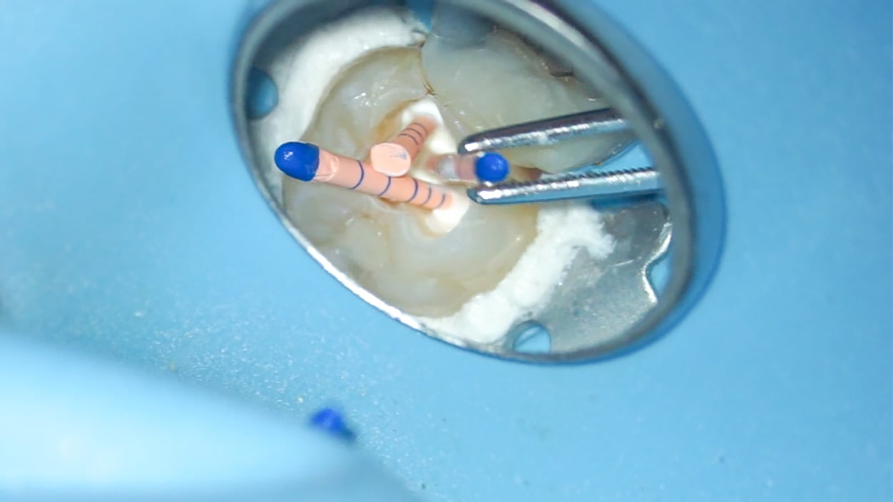 Radiographs taken prior to treatment revealed another complicating factor: calcified mesial canals. These are particularly hard to locate once the crown has been opened, requiring extra precision and care during the procedure.